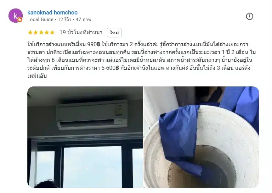 หนึ่งในรีวิวที่น่าประทับใจที่สุดคือ ลูกค้าท่านเดิมแชร์ว่า หลังจากล้างแบบพรีเมียมกับเราไปครั้งแรก เธอเว้นระยะการล้างนานถึง 1 ปี 2 เดือน (แม้ใจจริงเราจะแนะนำให้ล้างทุก 6 เดือนเพื่อสุขภาพที่ดีนะครับ) แต่สิ่งที่น่าทึ่งคือ ตลอดระยะเวลาปีกว่าๆ นั้น แอร์ไม่เคยมีอาการน้ำหยด ไม่เคยตัน และน้ำยายังอยู่ในระดับปกติ